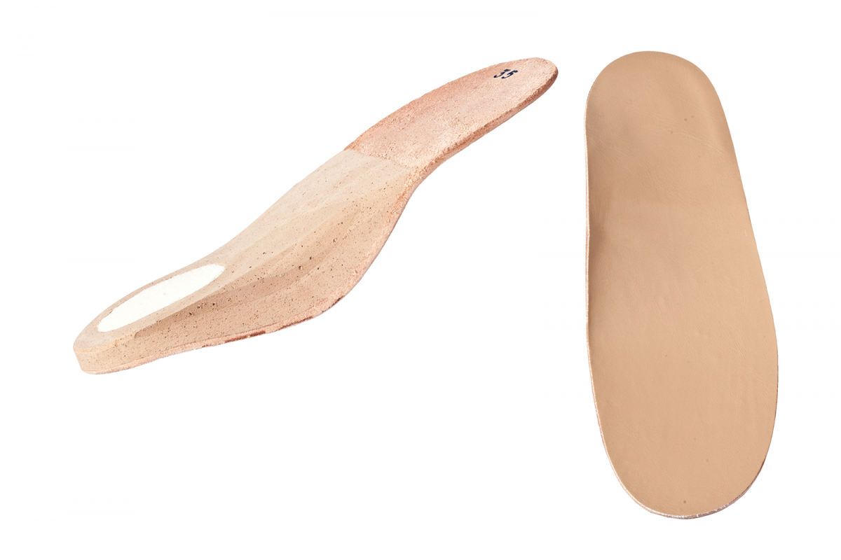 Round-toe, medially wedged insole with heel pad and medial longitudinal arch support, padded hole and synthetic leather lining.