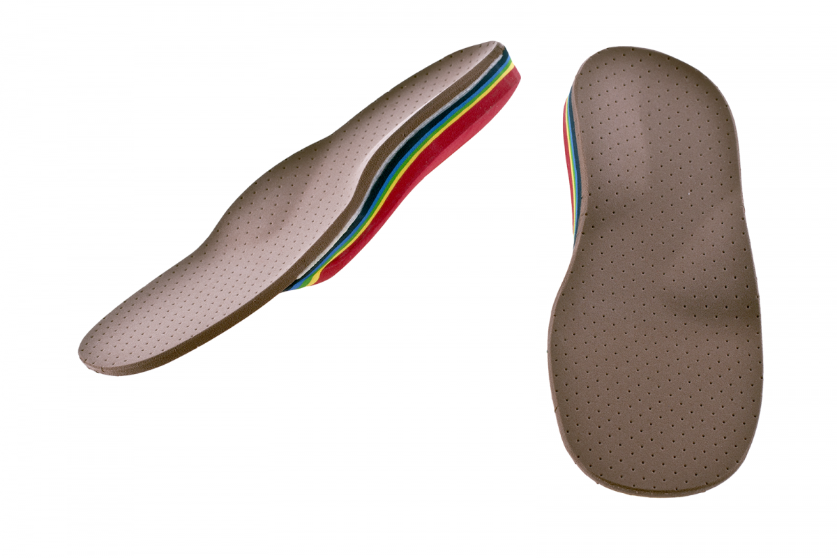 Semi-finished Lelièvre insole with rearfoot supination wedge and lateral pronation wedge. Strong colours after orthopaedic adaptation.