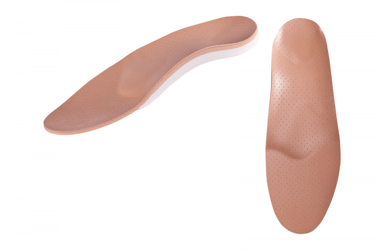 Orthèse plantaire semi-finie pour homme avec barre de soutien des voûtes longitudinale médiale et transversale, réalisée dans un matériau dépressible, recouverte de PPT et offrant davantage de confort et d’élasticité au pied.