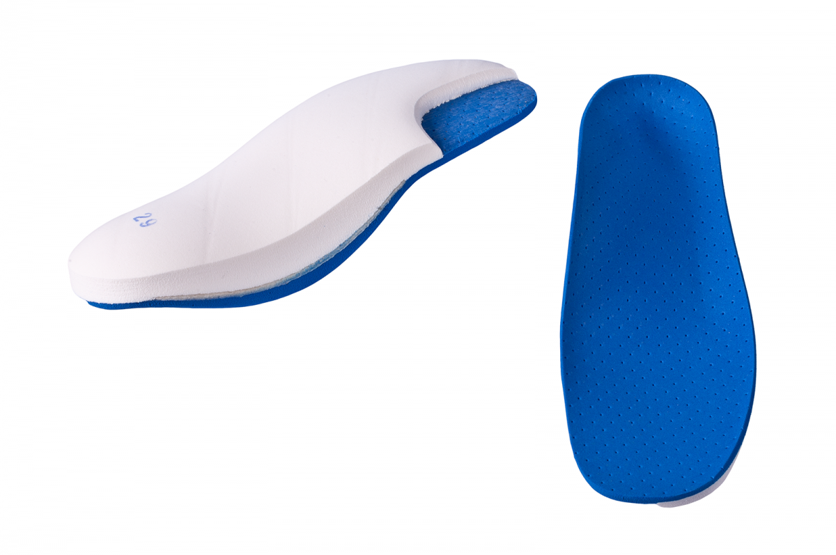Orthèse plantaire semi-finie avec soutien de la voûte longitudinale médiale et épaisseur totale de 10 mm, pour la correction du pied « en hélice », réalisée dans un matériau dépressible qui offre davantage de confort et d’élasticité au pied.